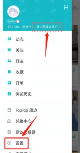 2、此时在左侧的菜单栏页面能看到青少年模式处于开启状态,点击设置按钮。