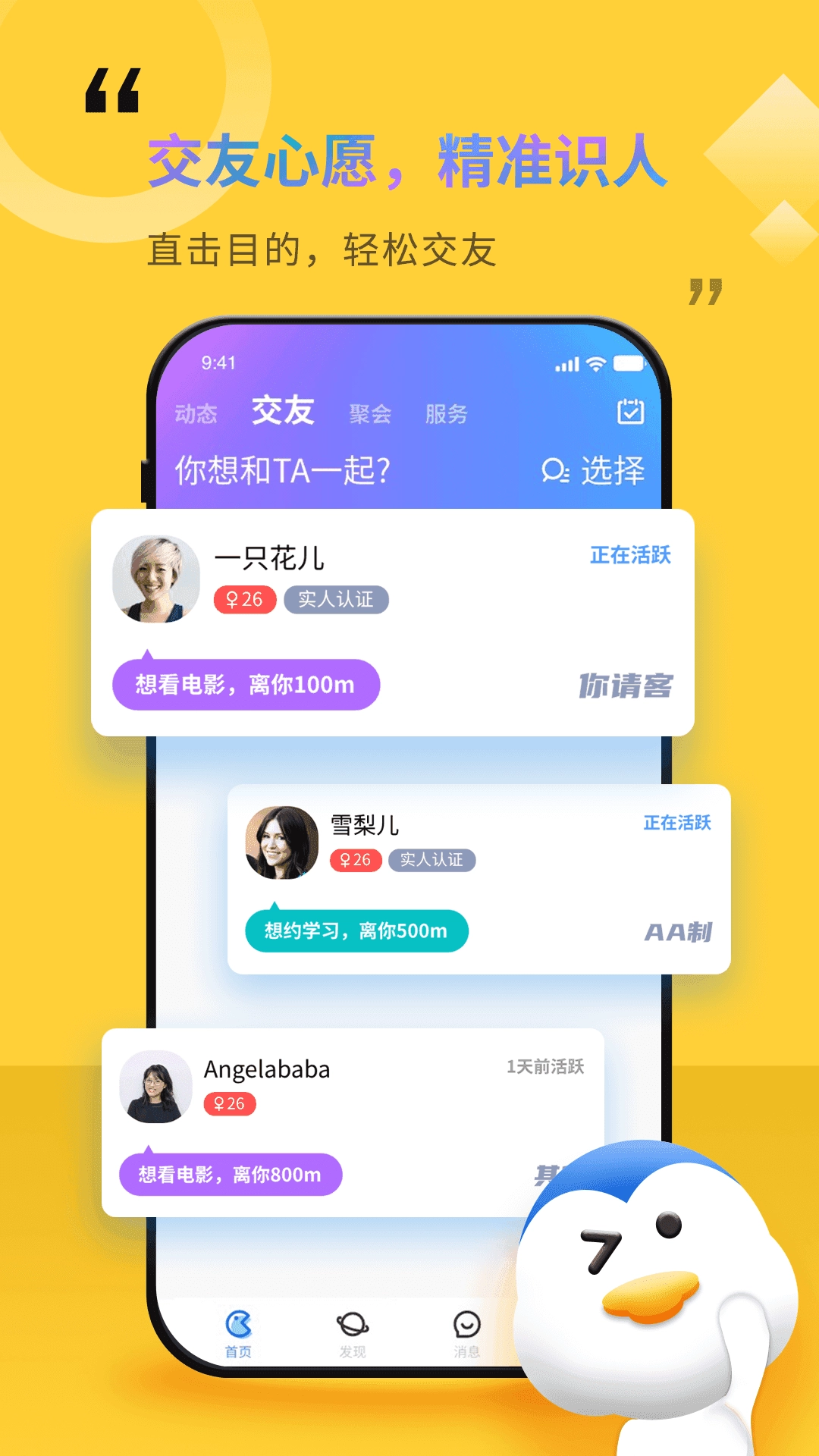 轻松交友认识新朋友,聊天分享生活展示自己,遇见心仪恋爱约会,享受生活不再单调~