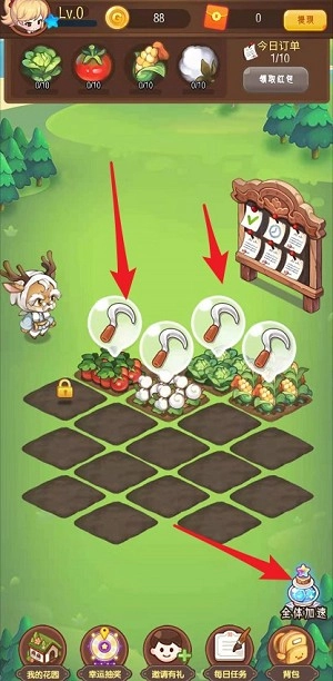 首次兑换红包得先达到1级,所以前期得做些种植操作。推荐用右下角的“全体加速”功能来加快进度,连续种两轮差不多就能升到一级了。
