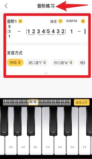 点击音阶练习模块后,你可以自定义练习的速度、音阶的顺序以及发音方式,再配合下方的钢琴键,就能开展实际的练声训练了。