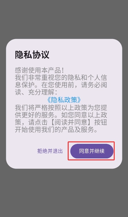 首次启动应用时,需要点击同意用户协议的弹窗,才能进入主界面开始使用。
