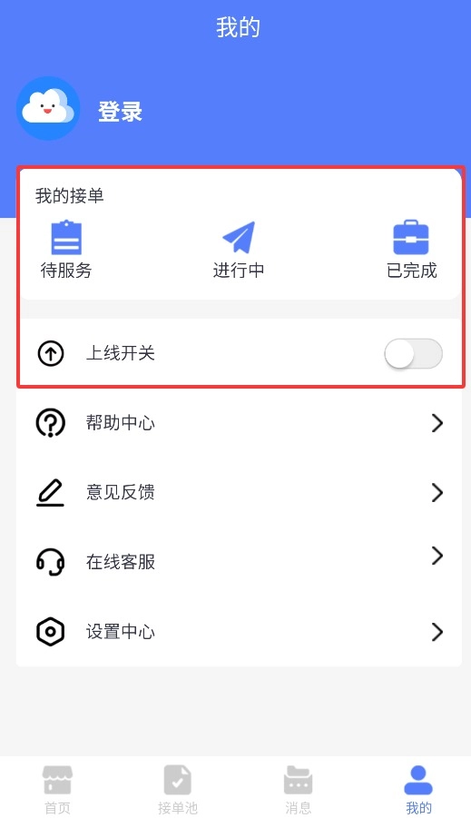 进入个人中心后,可管理接单状态并控制上线开关。