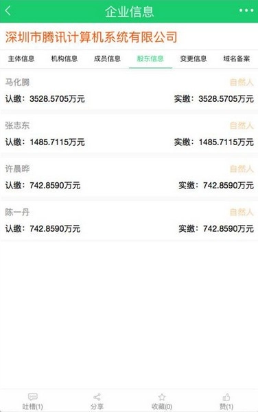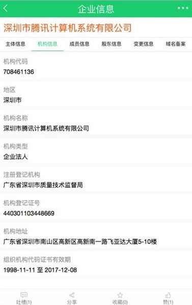 点击具体的条目之后就能看到主体信息了,包括法人代码、法人注册号、地址、经营范围等等,这时就可进行收藏、点赞、分享和吐槽了。
