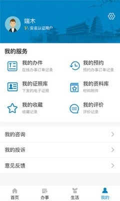 用户通过可以查询相关预约信息和具体办件进展情况,可以对产生的证照和提交的资料进行管理,可以查看自己的评价记录,可对具体部门具体事项进行不满意投诉并查看回复信息,可对后期优化升级在网上提出建议。办事不见面,服务不降低,动动手指,即可事成。