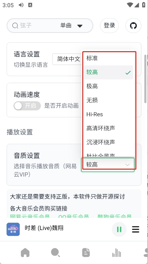 我的页面点击“音质设置”,选择要切换的音质即可。