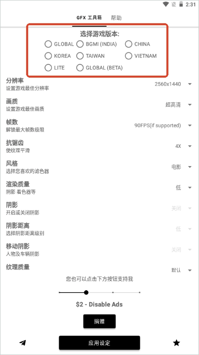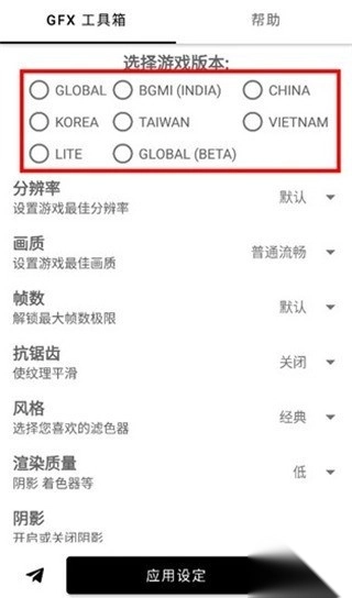 打开gfx工具箱,此时需要选择你所玩的吃鸡游戏版本;