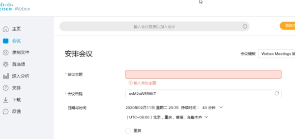 5、输入安排会议的主题、密码、会议日期、时间会议时长,输入与会者邮箱。
