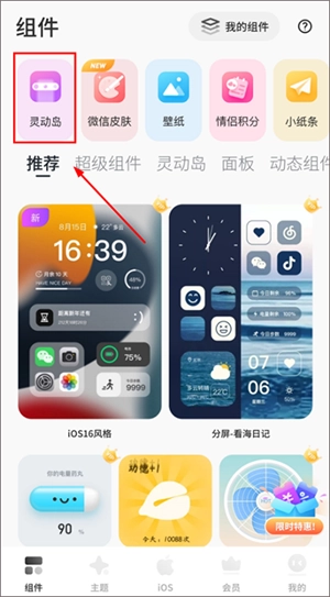 1、进入colorfulwidget后,在首页的上方点击【灵动岛】