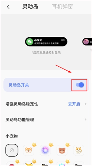 4、在【灵动岛】设置页面,向下滑动,用户可以为【灵动岛】添加宠物,和修改其位置。