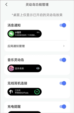 2、在【灵动岛】设置页面,点击【灵动岛开关】,将其打开即可。但为保证灵动岛功能正常使用请用户开启以下权限:【悬浮窗权限】、【通知使用权】。