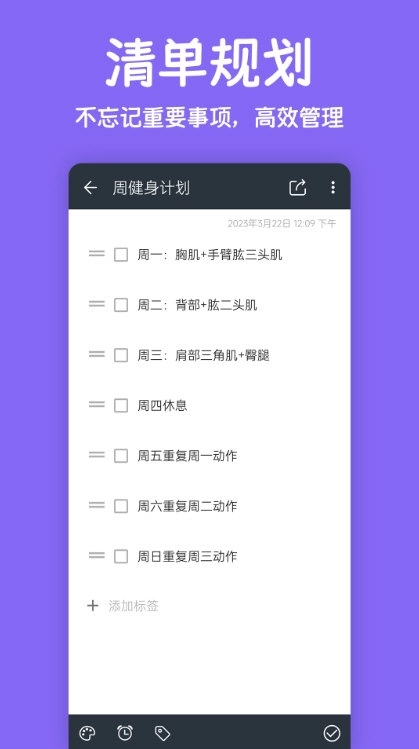 1、支持重复便签的计划提醒功能,针对重复便签的任务列表,可一键设置待办任务提醒,让重复任务清单的创建过程简单又高效。