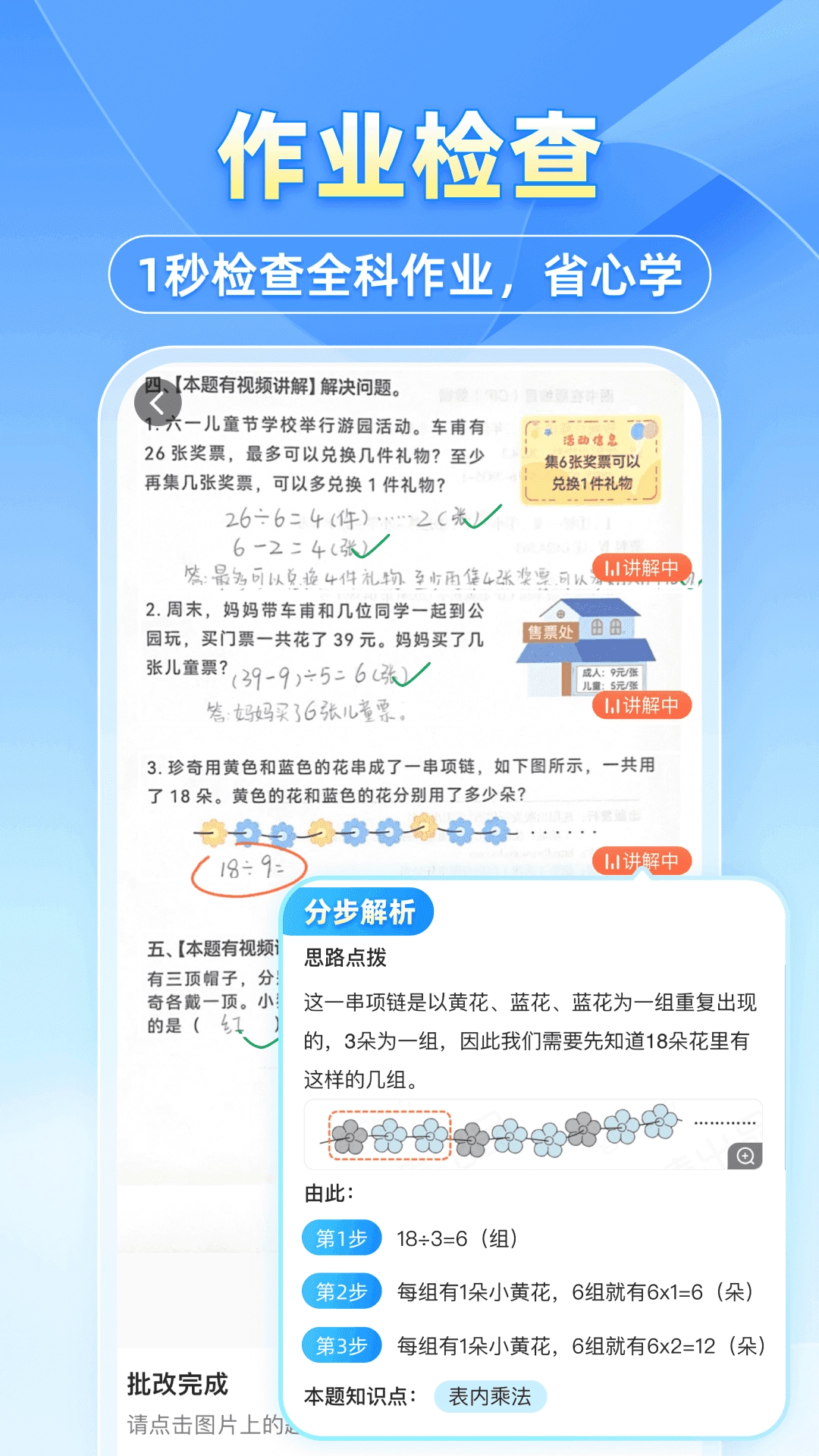 全国中小学家长检查作业和辅导工具,湖南卫视《天天向上》推荐使用的学习工具,?《最强大脑》合作平台!海量题库,?全面覆盖小学、初中、高中,包括数学、语文、英语、物理、化学、生物在内的主要学科。辅导作业遇到不会做的题,轻松一拍,就能找到详细解析,更有老师视频讲解,帮助孩子搞懂难题!