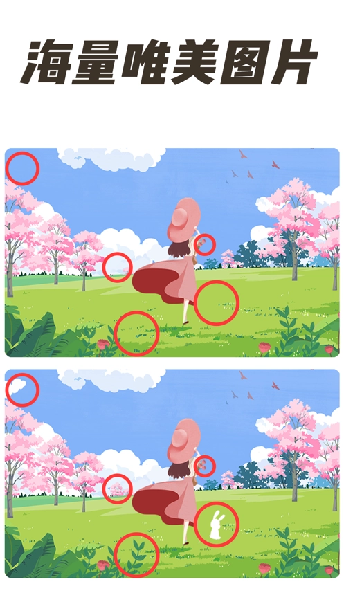 1、超多高清大图等待你来挑战,丰富关卡设置,融合多种干扰因素,你能找出所有不同吗?