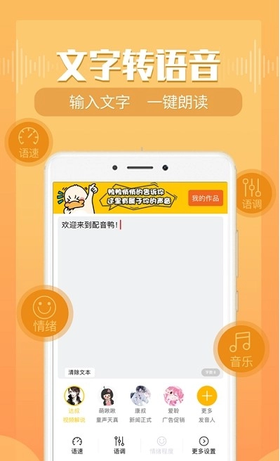 配音鸭文字转语音是一款文字快速转语音的配音软件,可以通过编辑的文字,转成各种类型的语音文件,萌妹子还是暖男帅哥声音,这里有许多的专业声音类型可以挑选,一键快速转换很方便,傻瓜式操作,极速导出语音文件,制作视频配音或者是广告配音等都会方便不少!
