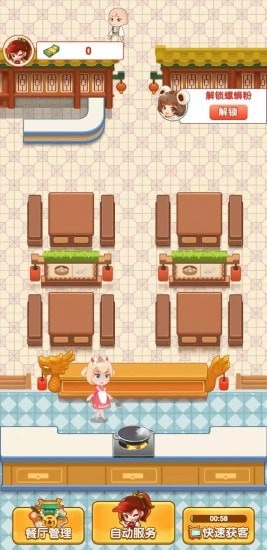 我们登录后,点击界面上的引导任务,购买桌椅、菜谱就可以开始经营餐厅了;