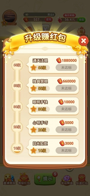 在闯关的过程中还能提升等级,达到10级可以领取3000红包券,20级能领5000红包券,30级可领10000红包券,55级能获得660000红包券,等级上限为65级,届时可领取1880000红包券。红包奖励十分丰厚,玩法充满刺激感,全民参与挑战,趣味满满。