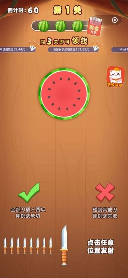 2、关卡难度都相对较低,例如只要飞刀插中水果,挑战就会失败。