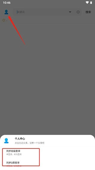 当然,软件支持登录功能,只需点击左上角的头像,即可弹出个人中心页面,在其中选择同步歌单的类型即可完成操作!