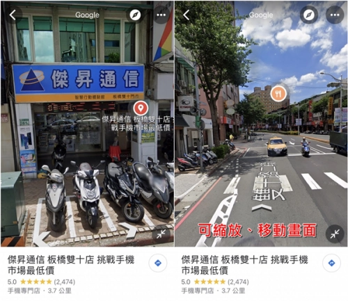 步骤三:接下来会进入Google「街景服务」功能,只需用手指进行缩放和360度滑动操作,就能直接查看该地点的实际景象了!