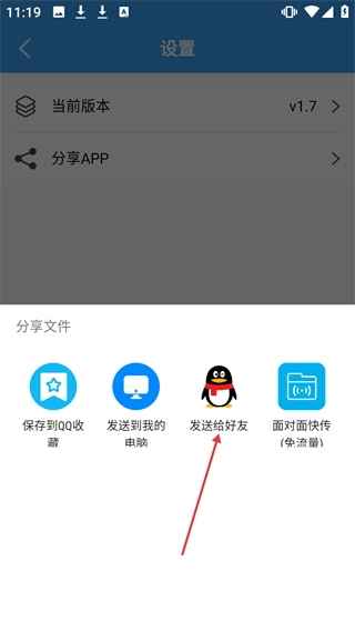 在【设置】里找到【分享】选项,点击【发送给好友】就能把内容分享给QQ好友。