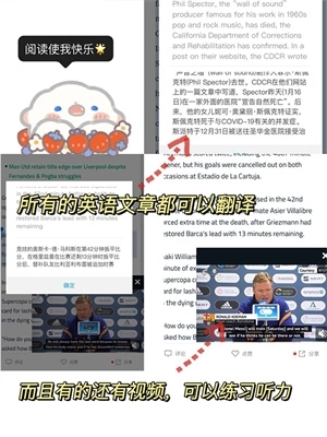 4、选择文章后长按全部都有翻译,这个真的很好,翻译全部都有,也不怕读不懂,而且有的文章还配有听力视频,可以锻炼听力能力。