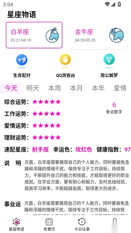 通过该平台能够查看今日运势,相关的详细数据也得到了清晰的呈现。