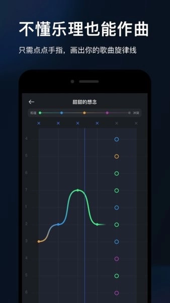 音乐作为比语言更高级的情感载体,拥有更强烈的情绪穿透力,却因诸多规则限制,将许多未接受专业音乐学习、却有创作潜质的人挡在门外;而音控的核心功能【画音作曲】,是融合了标准作曲逻辑的创新创作模式,无需掌握乐理知识、不识乐谱、不会演奏乐器,只要对音乐有敏锐的感知力,就能通过手指点触连线的方式谱写旋律,让每个普通人都能拥有这种高级的情感表达途径,也让每一位有创作天赋的人得以实现自己的音乐理想。