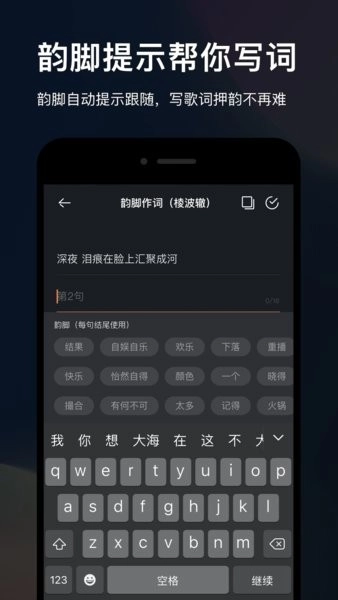 还有一个重要功能是【自由作词】,它能依据上一句的结尾动态给出韵脚提示,从而拓展押韵的选择范围,助力创作者激发想象力,让写歌词这件事变得轻松自如。