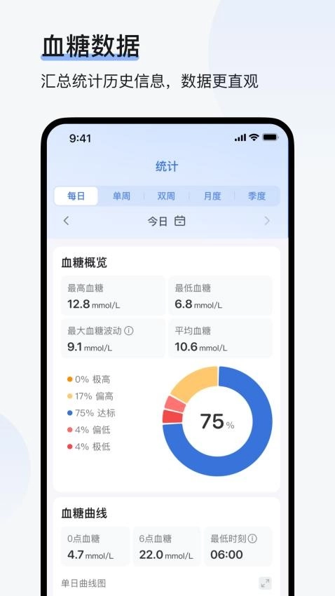 点击对应的统计时间类型,就能详细查看血糖概览,了解血糖曲线的变化情况。