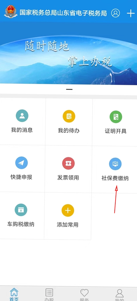 1、进入首页点击社保费缴纳。