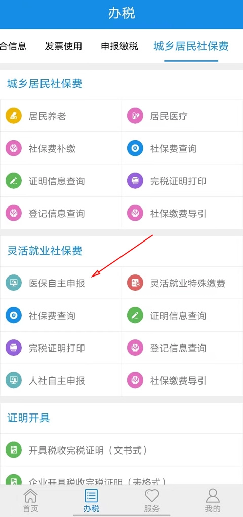 2、点击在城乡居民社保费中的灵活就业社保费下点击医保自主申报即可。