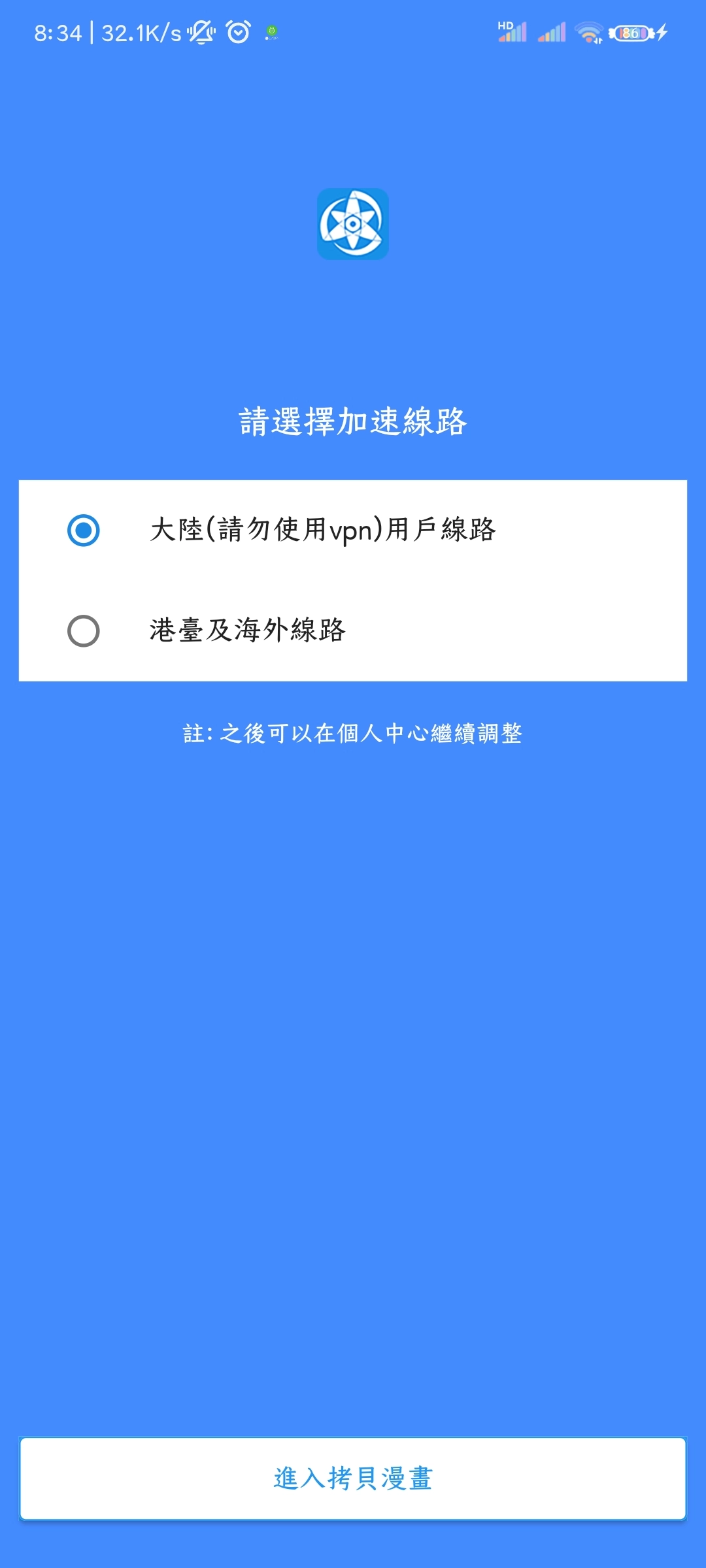 2.进入页面,选择加速线路,默认是大陆用户线路