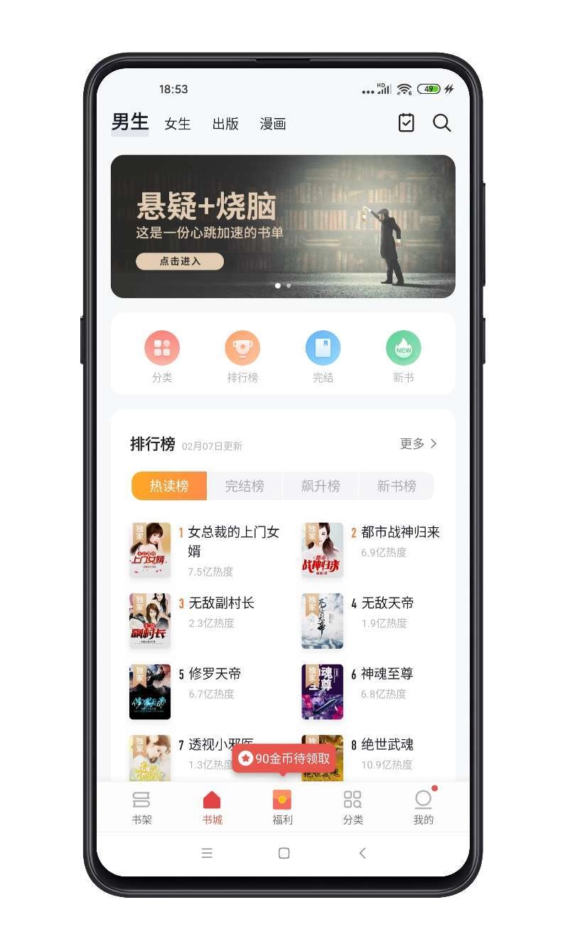 2、多维度榜单推荐:男频女频分类明确,完结与新书同步更新,让你随时把握流行趋势!