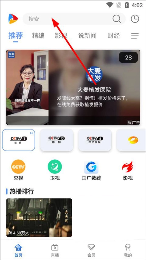 1、启动dopool电视并登录,进入首页后,可见央视频道、地方卫视、国广数藏、影视等栏目,用户可通过搜索框输入剧名查找视频。