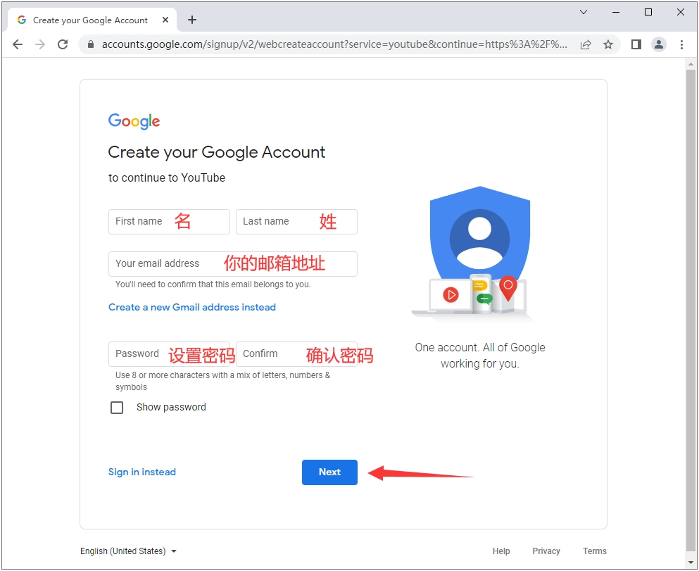 4、在这个页面,我们需要填写名、姓、可接收验证码的邮箱地址、设置谷歌账号的密码并确认密码,之后点击“Next”按钮。