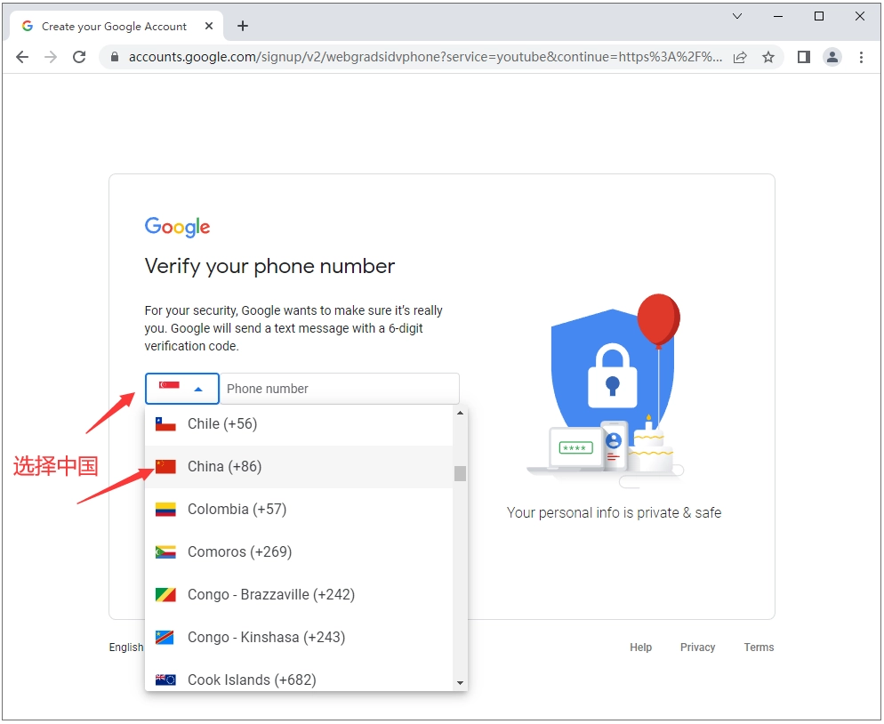 6、在这个页面,我们需要选择您所在国家的区号,要是您在中国境内,就得选择“+86”这个区号。