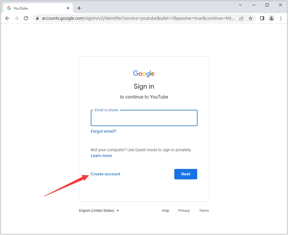 2、随后会跳转到谷歌的注册页面(由于谷歌与YouTube同属一家公司的产品),我们点击页面底部的“Create account”按钮。