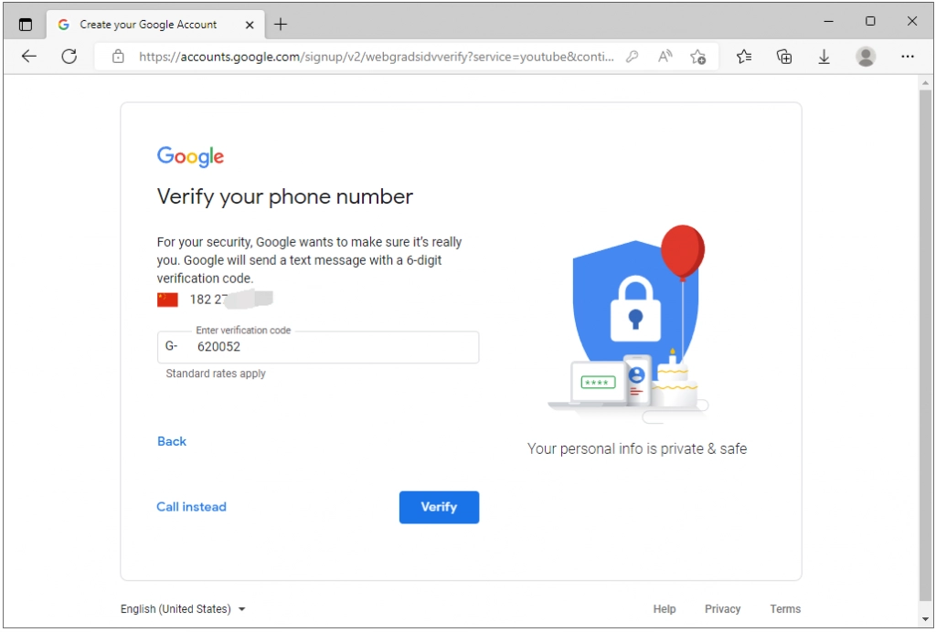 8、输入您收到的验证码,不少人在这一步会遇到阻碍,主要原因是浏览器未使用英文,进而导致无法接收验证码,还会被谷歌提示“此电话号码不能用于验证。”。
