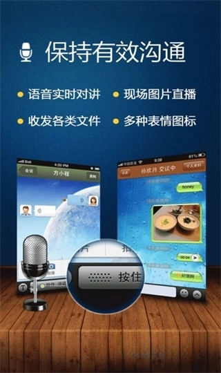 4、多人实时聊天、语音对讲、图片分享功能,让您与同事或朋友的沟通轻松自在,瞬间拉近彼此的距离。