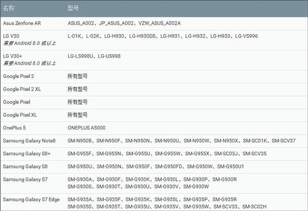 ARCore 能够在运行 Android 7.0(Nougat,牛轧糖)及更高版本系统的多台符合条件的 Android 设备上使用。在开发者预览阶段,ARCore 支持的设备如下(见下图)。