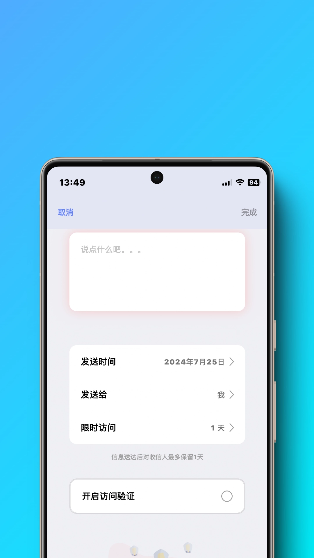 用户可以开启访问验证模式,之后在特定时间通过输入验证来访问时光信箱里的信件。