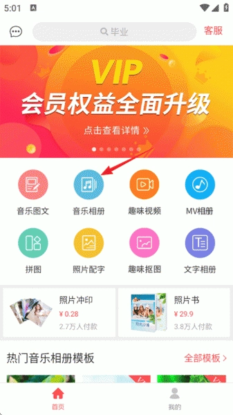 1、打开留影音乐相册,在首页点击音乐相册功能;