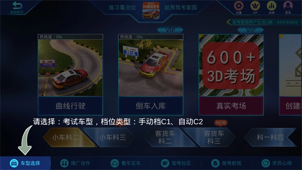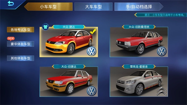5、刚开始进入练车时可以选择自己考试的车型和档位类型。