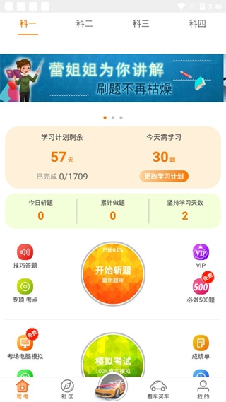 1、首先大家打开软件进入的是驾考页面,在这里有着科一到科四的学习时间、题目等等。