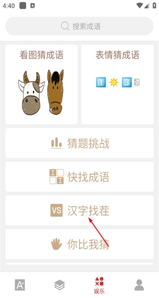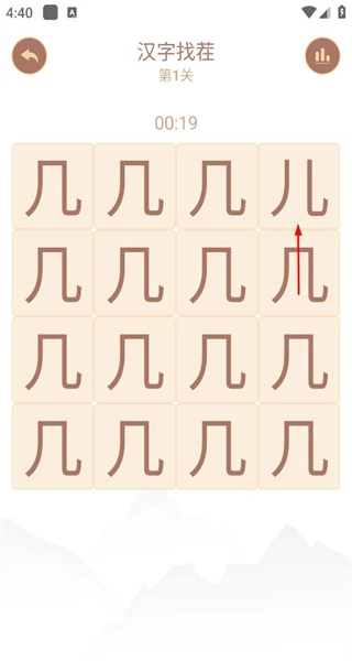 1、打开软件后,选择汉字找茬的选项,进入第一关的界面,准备开始汉字查找的任务。