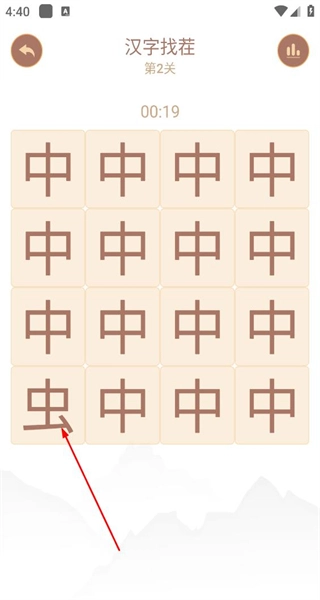 3、开启汉字找茬第2关,界面呈现由多个“中”字构成的方格,需从中找出“虫”字,以此完成该关卡的查找任务。
