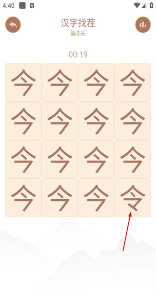 4、进入汉字找茬第3关后,界面会展示由多个“今”字组成的方格排列,你需要从中找出那个不同的“令”字,完成该关卡的查找任务。