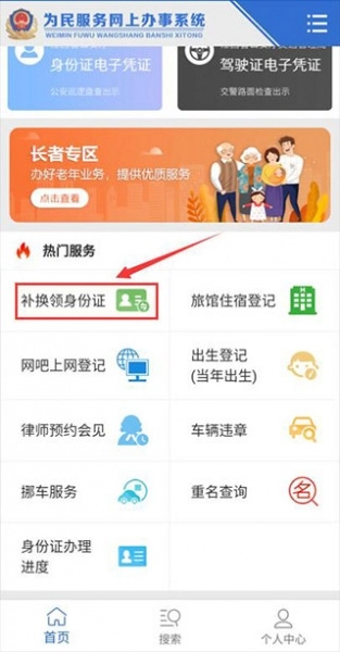 2、这时候我们在热门服务中就可以看到补换领身份证的选项了,点击后即可进入此功能。