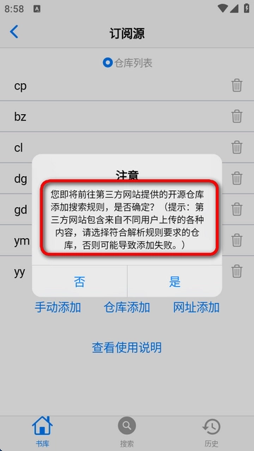 2、进入订阅源页面即可查看所有仓库列表,同时支持手动添加仓库。