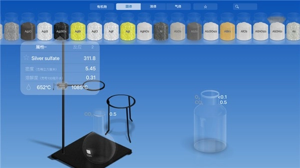 2、把器皿摆放好后,接下来就可以点击“水滴”图标来挑选各式各样的化学原料了。该软件提供了化合物、固体颗粒、液体和气体这四大类原料,当选择对应的化学原料时,会显示出与其相关的化学元素。